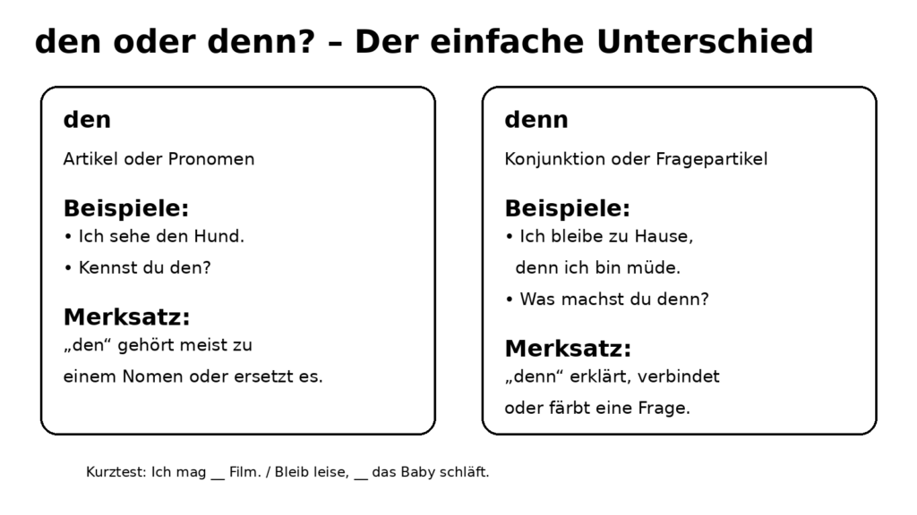 Wer den Unterschied verstanden hat, kann nicht nur fehlerfreier schreiben, sondern auch Sätze bewusster lesen und bilden. In diesem Beitrag erfährst du einfach und verständlich, wann du „den“ und wann du „denn“ verwendest. Außerdem findest du eine Tabelle, eine kleine Übung und eine anschauliche Grafik.
