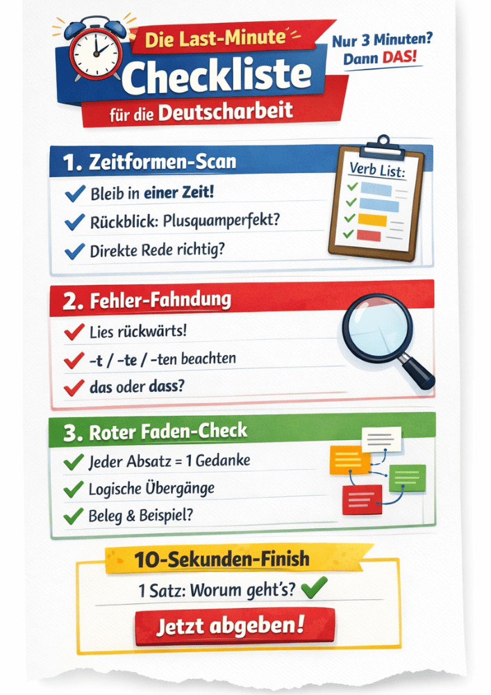 Du kennst dieses Gefühl: Die Zeit ist fast um, der Stift liegt schon halb auf dem Tisch, und du fragst dich, ob du noch schnell etwas verbessern solltest – oder ob du damit nur alles durcheinander bringst. Genau für diesen Moment gibt es eine universelle Last-Minute-Checkliste. Sie ist nicht dazu da, den ganzen Text neu zu schreiben. Sie hilft dir, in wenigen Minuten die häufigsten Punktverluste zu vermeiden: Zeitformen, Rechtschreibung und roter Faden.